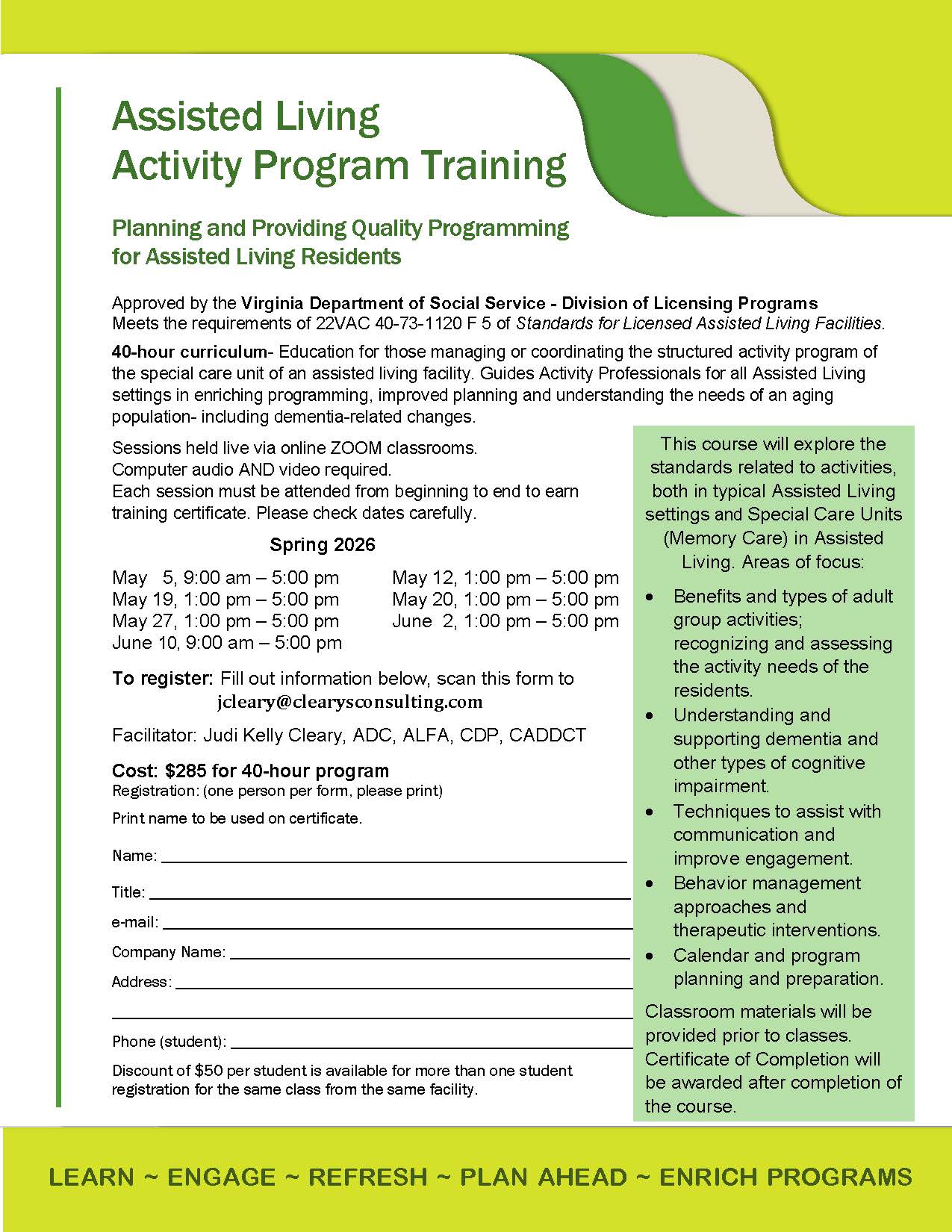 Download flyers to complete registration information and scan to jcleary@clearysconsulting.com.